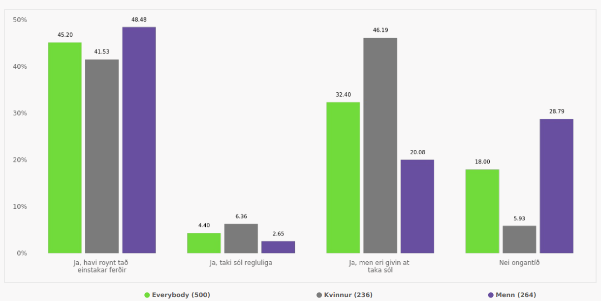Upp á spurningin, um tey nakrantíð hava tikið sól, siga 45% seg hava roynt tað einstakar ferðir, meðan 18% siga seg ongantíð hava roynt tað.